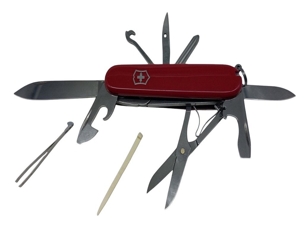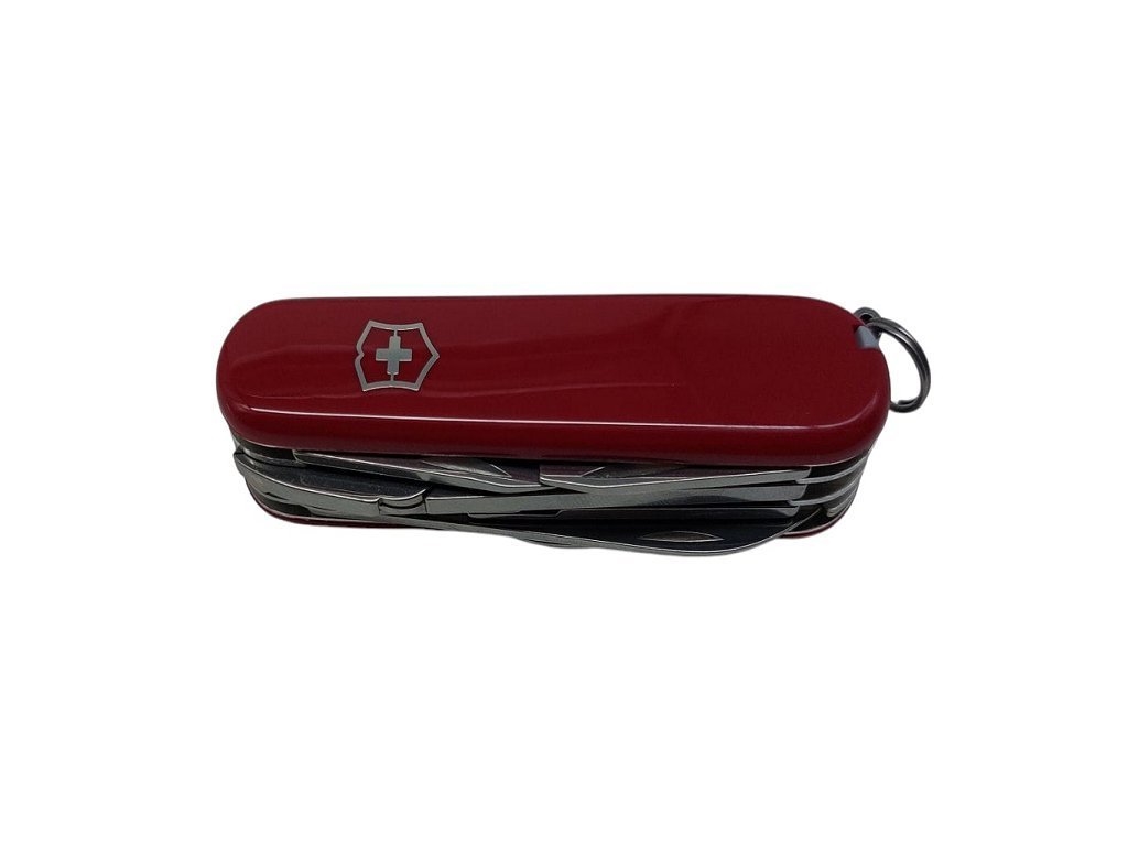 Coltello sportivo. Dotato di: lama grande, lama piccola, cavatappi a croce, apriscatole con - cacciavite piccolo, levacapsule con - cacciavite-spelafili, punteruolo, anello portachiavi, pinzetta, stuzzicadenti, forbici, gancio multiuso, pinze con taglia fili. Lunghezza chiuso 9 cm. Guancette in plastica rossa lucida e croce incisa. Prodotto in Svizzera. Peso lordo: 129 grammi.