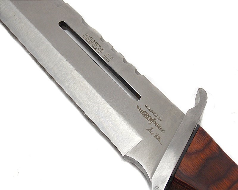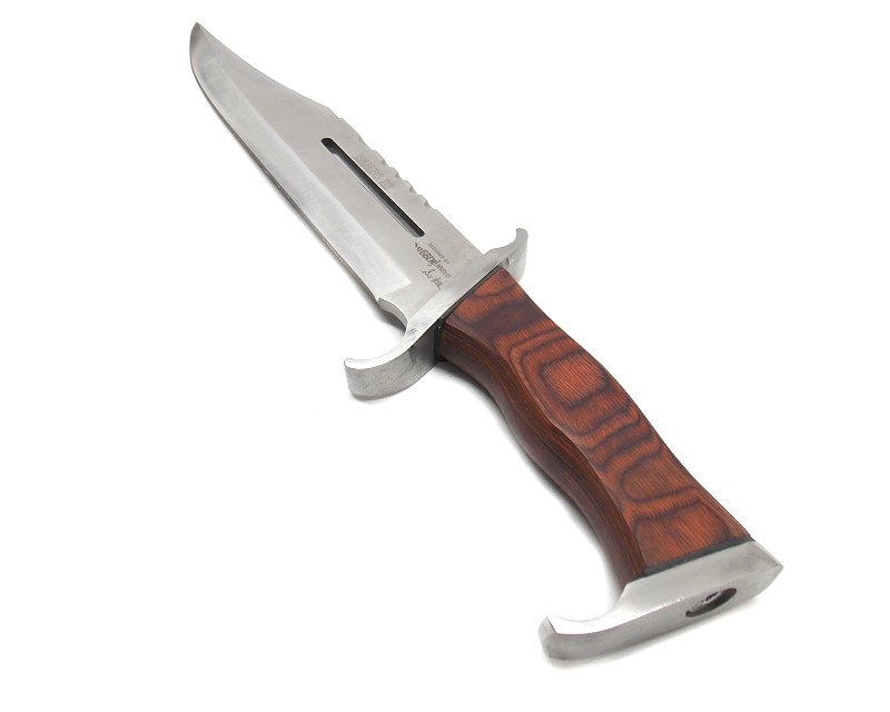 Coltello sportivo. LUNGHEZZA LAMA 27 CM, LARGHEZZA LAMA MASSIMA 5 CM, LUNGHEZZA TOTALE 42 CM. LAMA FORATA. DOTATO DI FODERO CON PASSANTE PER CINTURONE. Peso lordo: 890 grammi.