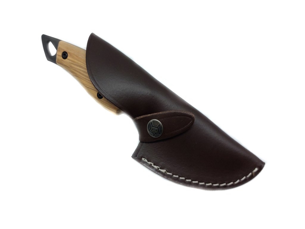 Coltello sportivo. Lunghezza lama 8 cm, larghezza lama massima 4 cm, lunghezza totale 19,5 cm. Lama fissa in acciaio brunita. Dotato di fodero in cuoio marrone, con passante per cinturone. Manico in olivo finemente lavorato a mano. Prodotto in Italia. peso lordo: 277 grammi.