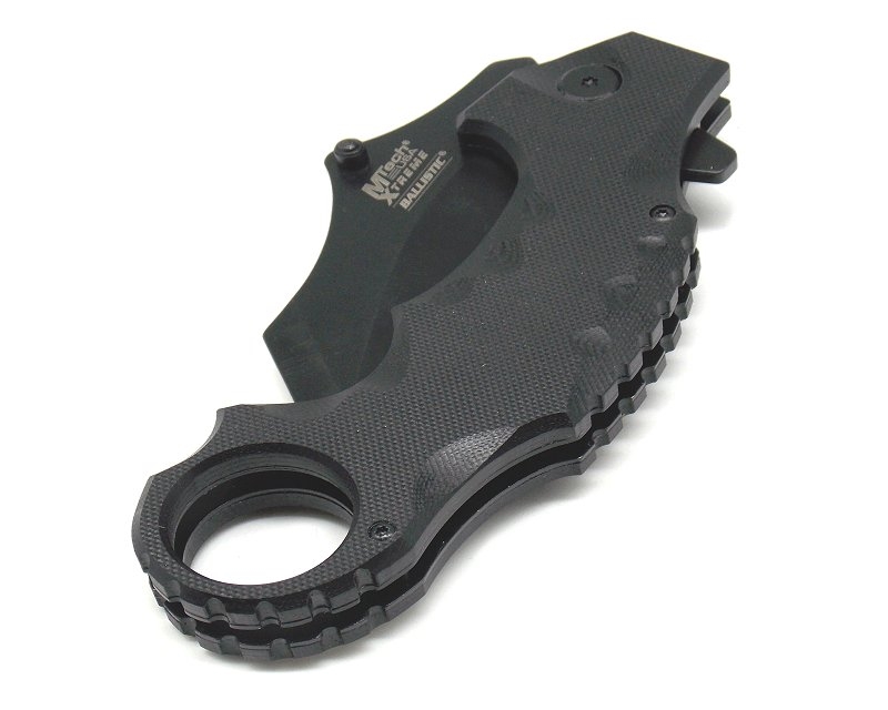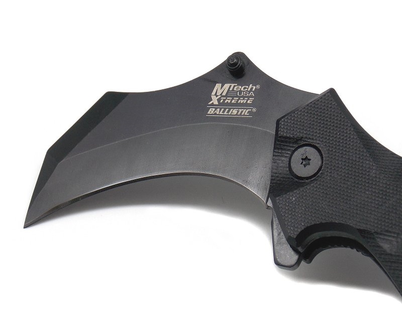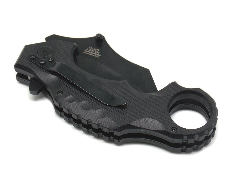 Lunghezza lama aperta 7 cm, larghezza lama massima 3,5 cm, lunghezza totale aperto 18,5 cm. Lama in acciaio brunita. Manico in metallo. Dotato di blocco lama e di clip per metterlo al cinto. Peso lordo: 220 grammi.