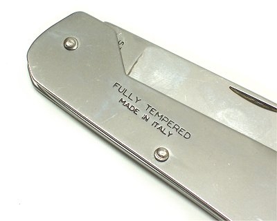 Coltello totalmente in acciaio inossidabile. Lunghezza lama 6,5 cm, larghezza lama 2 cm, lunghezza totale aperto 18,5 cm. Peso lordo: 95 grammi. Con giri grilli. Prodotto in Italia.