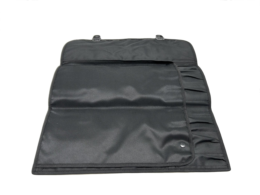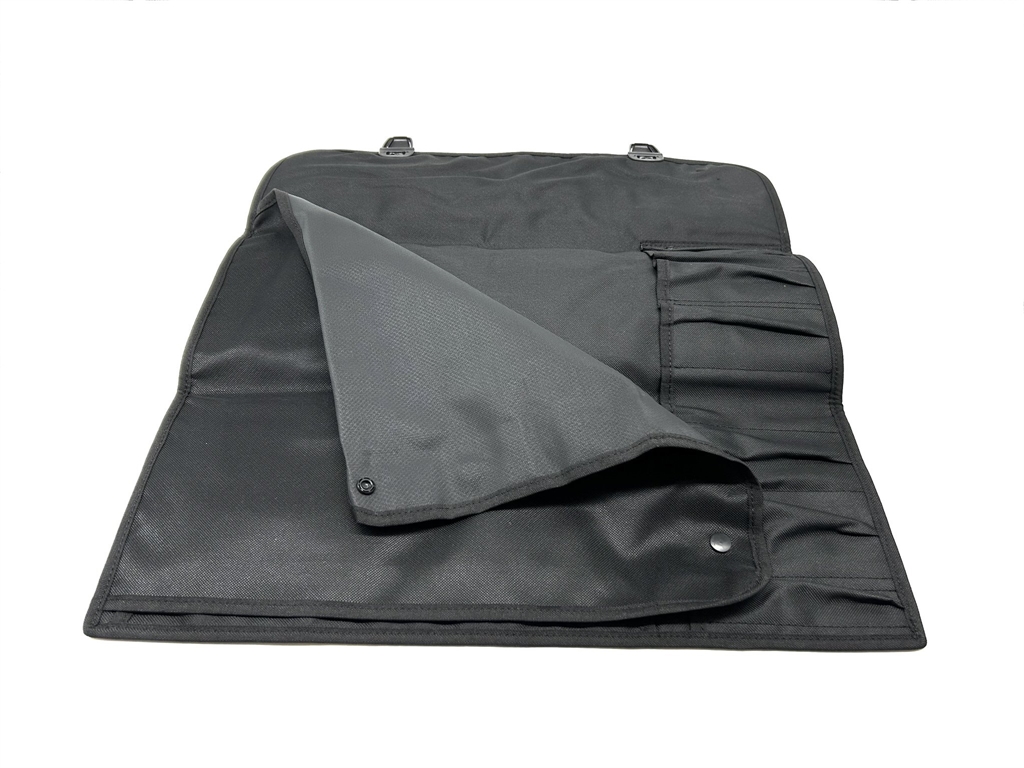 Borsa avvolgibile in scay nero, con pattina di protezione interna. Può contenere otto coltelli. Chiusura con due fibbie in polimero a scatto. Dimensioni della borsa chiusa: 49x19,5 cm. Peso lordo: 450 grammi. Prodotto in Italia.