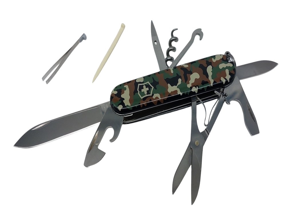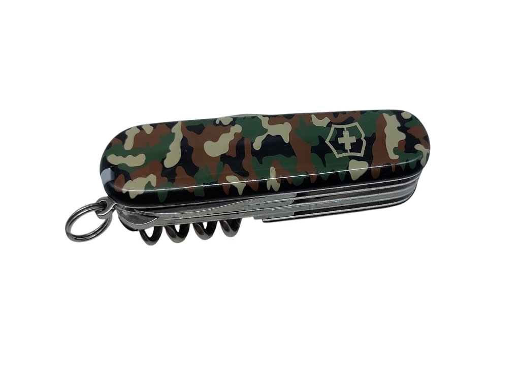 Multiuso dotato di: lama grande, lama piccola, cavatappi, apriscatole con cacciavite piccolo, levacapsule con cacciavite, spelafili, punteruolo, anello portachiavi, pinzetta, stuzzicadenti, forbici, sega per il legno. Lunghezza chiuso 9 cm. Guancette colore camo. Prodotto in Svizzera. Peso lordo: 103 grammi.