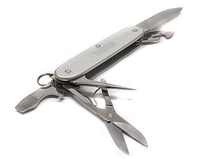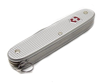 Multiuso dotato di: lama grande, alesatore, apriscatole con cacciavite 3 mm, levacapsule con spela fili, cacciavite 5 mm, forbici, anello portachiavi. Lunghezza da chiuso 9 cm. Guancette in Alox argento striato, cioè sono realizzate in alluminio anodizzato e successivamente sottoposte ad un processo di ossidazione che crea uno strato protettivo in grado di preservare da danni e dalla corrosione. Peso lordo: 98 grammi. Prodotto originale svizzero.