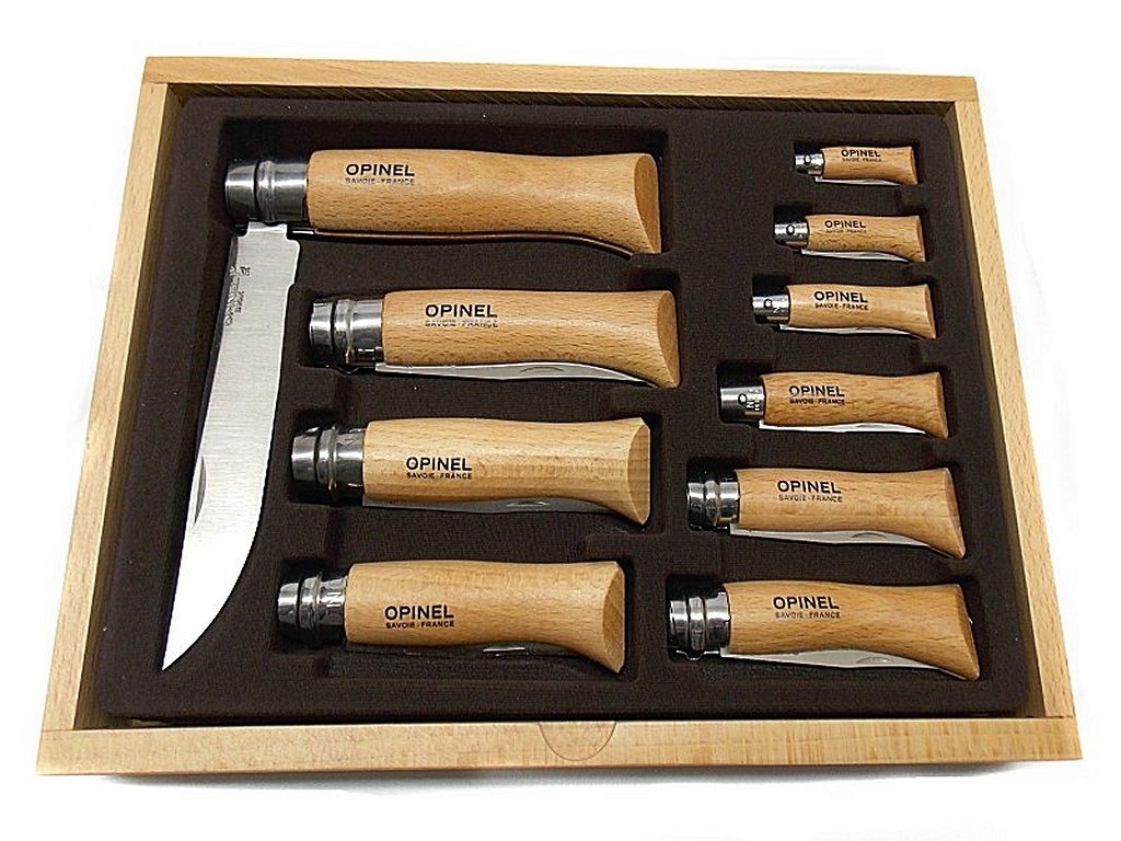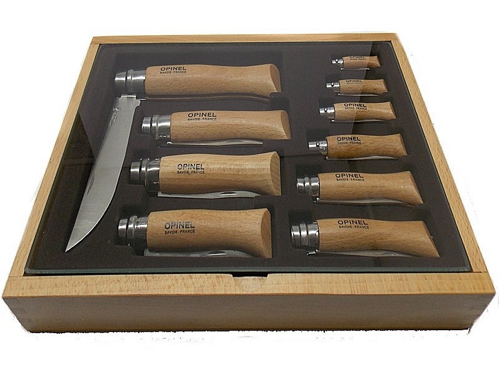 Set di 10 coltelli opinel di diverse misure. Hanno lama in acciaio inox e manico anatomico in legno chiaro stagionato. Scatola in legno con vetrina nella parte superiore. Dimensioni scatola: 31,5x19,5x4 cm. Prodotto in Francia. Peso lordo: 1285 grammi