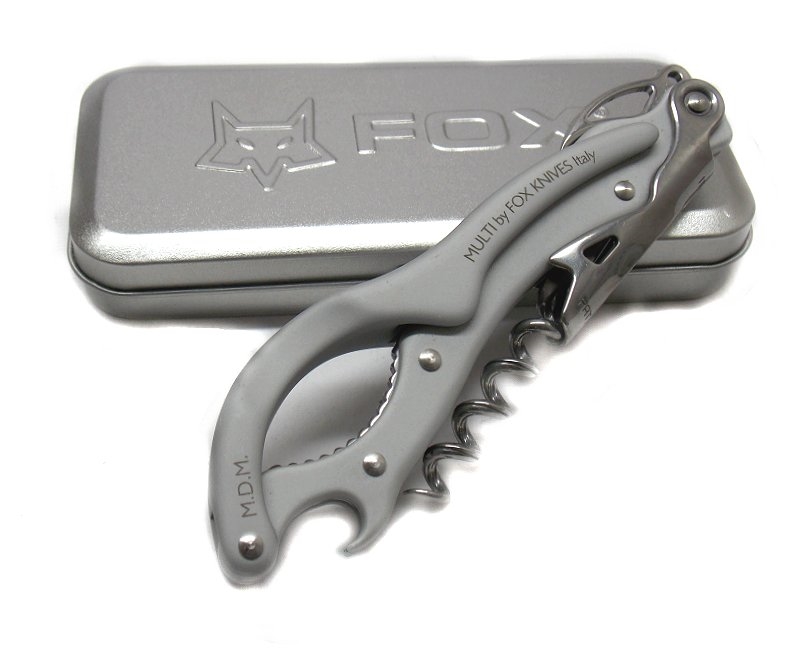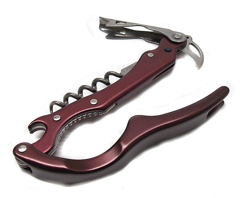 Dotato di cavatappi, schiaccianoci, aprilattine, coltellino la cui lunghezza lama seghettata è di cm 2,4. Lunghezza chiuso cm 14, larghezza massima cm 3,8. Manico in alluminio, le restanti parti in acciaio inox. Colori disponibili: grigio, nero, rosso. Dotato di cofanetto in metallo. Prodotto in Italia. Peso lordo: 185 grammi.