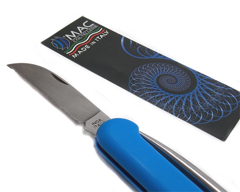 Coltello sportivo. Lunghezza lama 6,5 cm, larghezza lama 1,7 cm, lunghezza totale aperto 18 cm (con punteruolo lunghezza totale 26,5 cm). Lama in acciaio inossidabile, manico in gomma blu. Dotato di blocco lama e cavigliera. Prodotto in Italia. Peso lordo: 130 grammi.