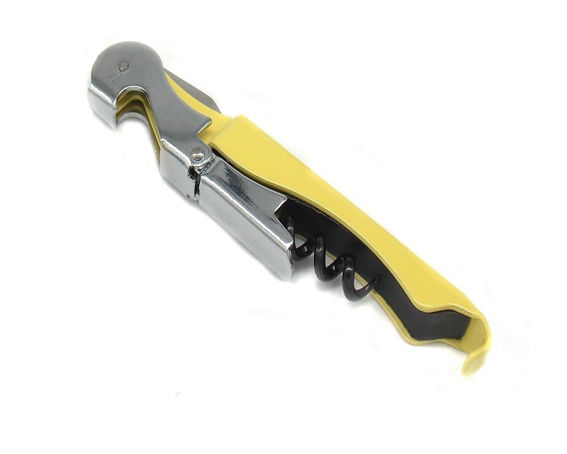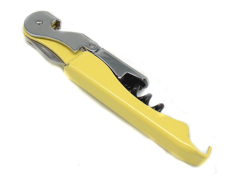 Cavatappi in acciaio. Dimensioni da chiuso: lunghezza 12,5 cm, larghezza 2,5 cm. Manico di colore giallo. Peso lordo: 79 grammi.