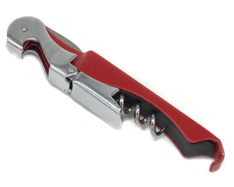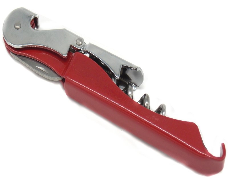 Cavatappi in acciaio. Dimensioni da chiuso: lunghezza 12,5 cm, larghezza 2,5 cm. Manico di colore granata. Peso lordo: 73 grammi.