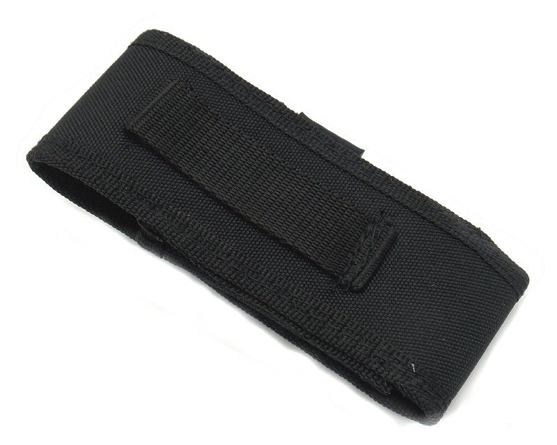 Fodero in nylon nero con passante cintura alto 7 cm. Chiusura con bottone a pressione. Lunghezza 13 cm, larghezza 4,5 cm. Peso lordo: 29 grammi.