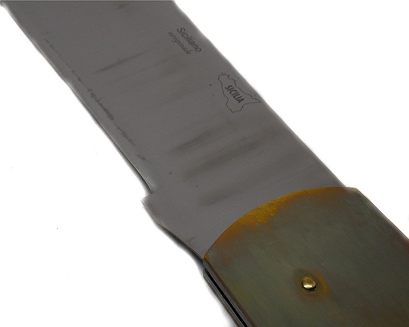 Coltello siciliano con manico in ottone , lama in acciaio inox con stampa a laser sulla lama della Sicilia. Lunghezza totale aperto 80 cm. Lunghezza lama 33 cm. Larghezza manico 6 cm, spessore manico coltello 10 mm. Prodotto in Italia. Peso lordo: 1806 grammi.