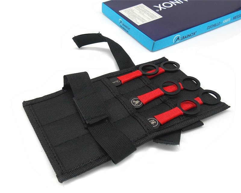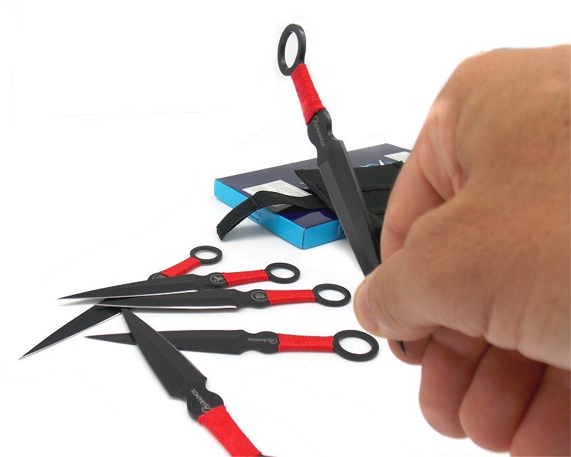 Set da 6 coltelli sportivi da lancio con un solo filo.. Lunghezza lama 8,5 cm, larghezza lama massima 2 cm, lunghezza totale 16 cm. Dotato di fodero in tela nera con due fasce elastiche regolabili con velcro. Coltello di colore nero, con corda rossa nel manico. Peso lordo: 278 grammi