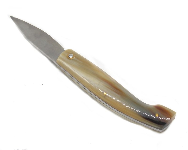 Coltello sportivo. Lunghezza lama 9,5 cm, larghezza lama massima 2 cm, lunghezza totale aperto 22 cm. Lama in acciaio inox, manico in corno biondo. Prodotto in Italia. Peso lordo: 83 grammi.
