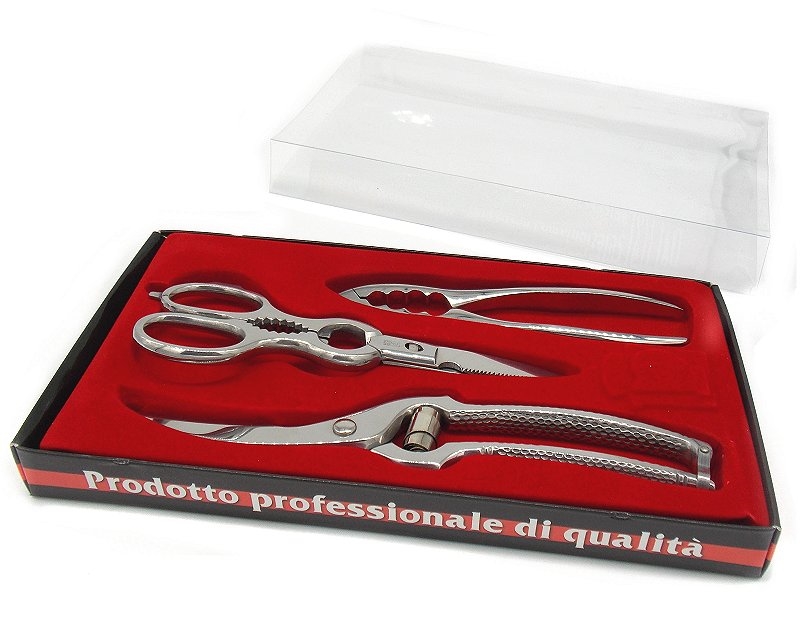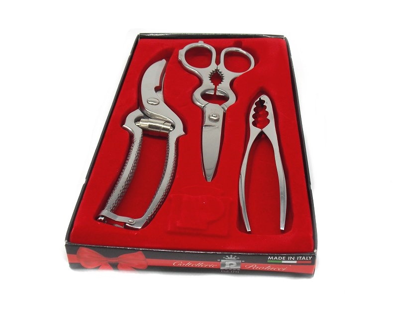 Confezione composta da un trinciapollo in acciaio inox lungo 24,5 cm, una forbice da cucina in acciaio inox lunga 20 cm ed un rompinoci in acciaio inox lungo 18 cm. Confezione in cartone cu un morbido panno rosso all'interno. Ottima idea regalo. Prodotto in Italia. Peso lordo: 801 grammi.