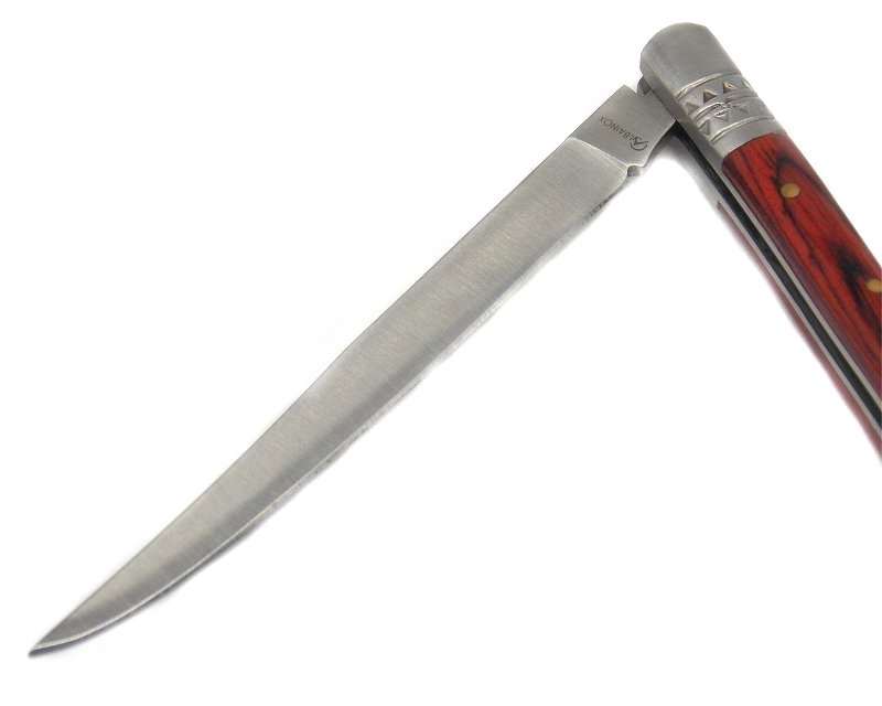 Coltello sportivo. Lunghezza lama 7cm, lunghezza totale aperto 15,5 cm, larghezza lama 0,5 cm. Lama in acciaio inox. Manico in stamina, cioè legno laminato e tinto, molto resistente. Peso lordo: 29 grammi.