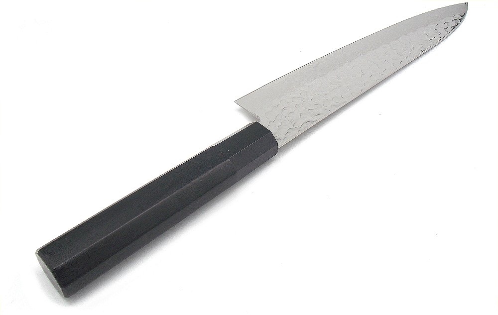 Coltello cuoco professionale giapponese da cucina. Lunghezza lama 22 cm, larghezza lama massima 4,5 cm, lunghezza totale 34,5 cm. Lama Sandvik, la parte esterna martellata crea un effetto antiaderente ed è realizzata in acciaio inossidabile 410, mentre la parte del filo tagliente è in acciaio inossidabile giapponese VG10 con alto contenuto di carbonio e raggiunge una durezza di HRC 59-60, che garantisce un taglio efficace e duraturo nel tempo.. Manico in POM nero ,di forma ottagonale, confortevole, resistente, igienico e duraturo. Prodotto in Giappone. Peso lordo: 310 grammi.