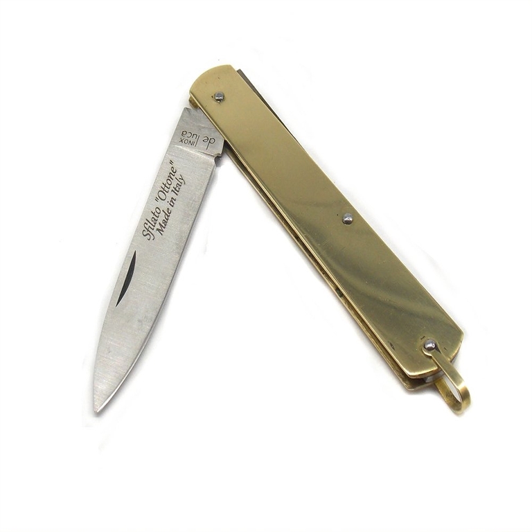 Coltello sportivo. Lama in acciaio inox temperato con durezza superiore ai 55 HRC. Lunghezza totale aperto 15 cm, lunghezza lama 6 cm, larghezza lama 1,2 cm. Manico in ottone. Con anellino. Prodotto in Italia. Peso lordo: 42 grammi.