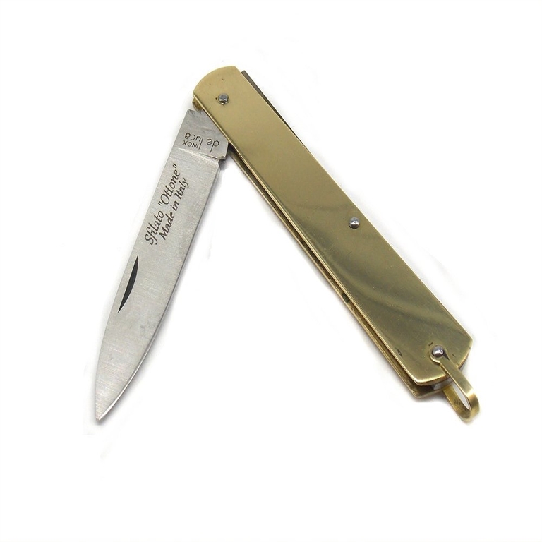 Coltello sportivo. Lama in acciaio inox temperato con durezza superiore ai 55 HRC. Lunghezza totale aperto 21 cm, lunghezza lama 8,5 cm, larghezza lama 1,6 cm. Manico in ottone. Con anellino. Prodotto in Italia. Peso lordo: 79 grammi.