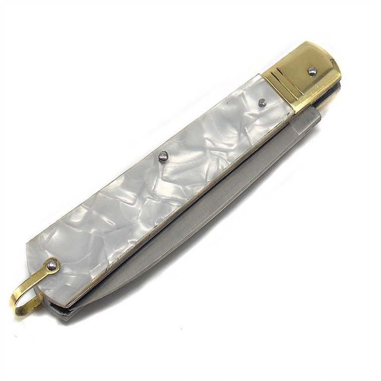 Coltello sportivo. Lama in acciaio inox temperato con durezza superiore ai 55 HRC. Lunghezza totale aperto 19 cm, lunghezza lama 8 cm, larghezza lama 1,4 cm. Manico tipo perla. Con anellino. Prodotto in Italia. Peso lordo: 67 grammi.