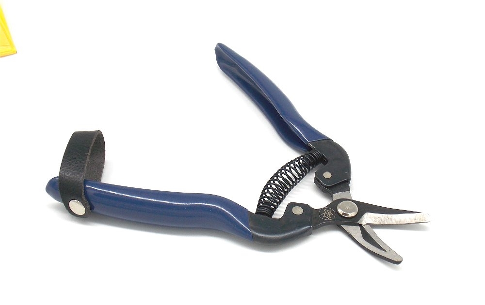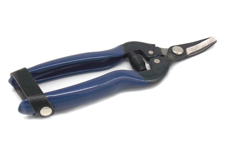 Lama curva in acciaio inox. Lunghezza totale 17 cm, lunghezza lama 3 cm. I manici sono in gomma antiscivolo blu per una facile presa. Comoda cinghietta in pelle che assicura la chiusura della forbice. Prodotto in Italia. Peso lordo: 118 grammi.