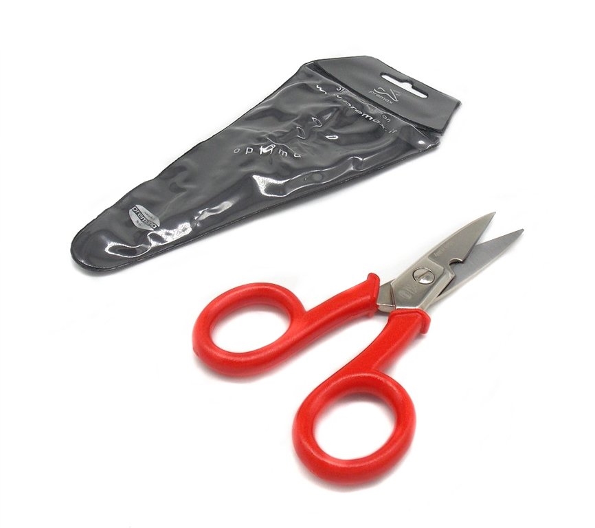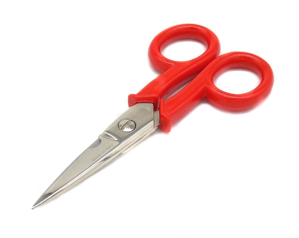 Forbici con lame in acciaio e manici in nylon rosso. Lunghezza 14 cm. Prodotto in Italia. Peso lordo: 90 grammi.