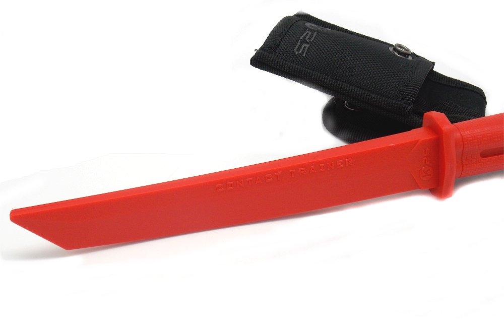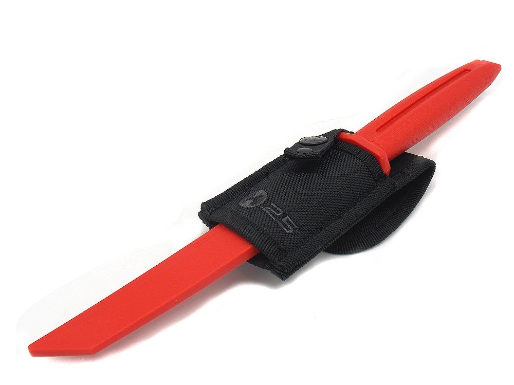 Coltello sportivo. Coltello in polimero rosso. Lunghezza lama 18,5 cm, larghezza lama 2,8 cm, lunghezza totale 33 cm. con custodia in tela nera per metterlo nel cinturone con altezza massima 5 cm. Peso lordo: 222 grammi.