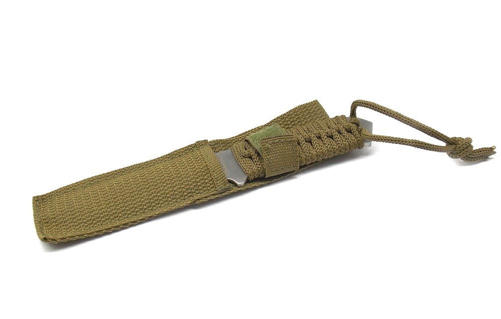 Coltello sportivo. Lunghezza lama fissa 10 cm, larghezza lama massima 2,5 cm, lunghezza totale 20 cm. Lama in acciaio. Manico rivestito con corda verde. Dotato di fodero in tela verde con passante per cinturoni. Peso lordo: 132 grammi