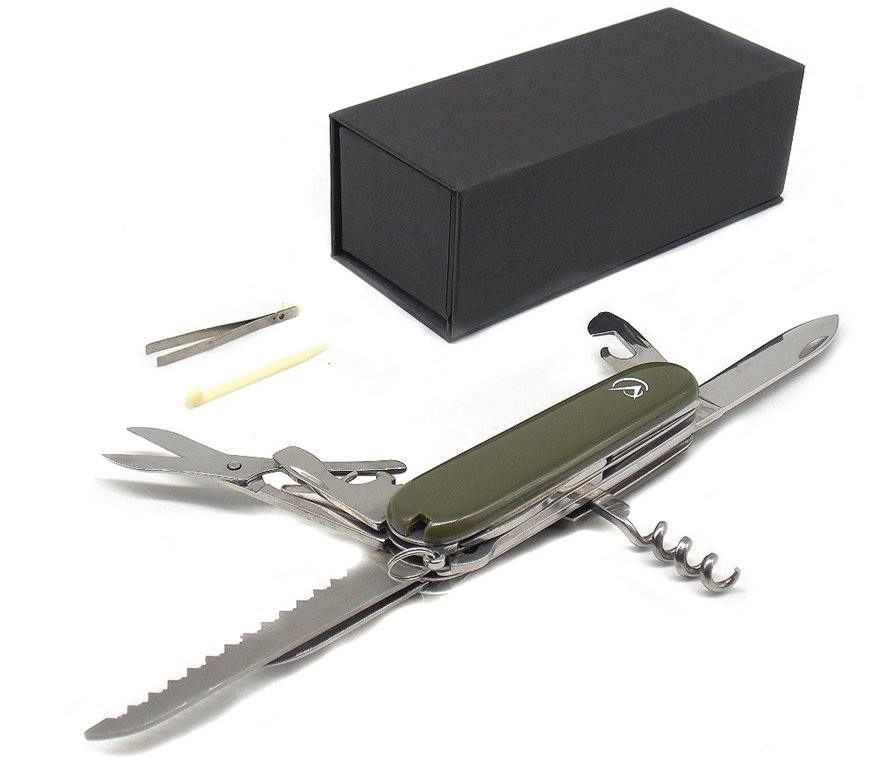 Contiene: stuzzicadenti, lama grande e lama piccola, cavatappi, pinzetta, forbici, seghetto, apribottiglie, punteruolo, anellino, uncino, limetta. Lunghezza lama: 6 cm. Dimensioni da chiuso: 9x2,5x2 cm. Peso lordo: 190 grammi.