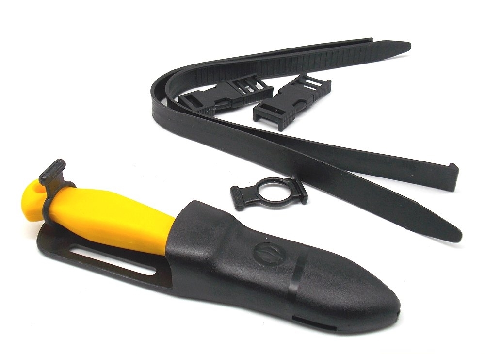Coltello sportivo. Lunghezza totale 19 cm, lunghezza lama 9 cm, manico in polimero giallo. Lama in acciaio inox seghettata e curva, spessore 3,8 mm. Dotato di fodero in polimero con passante. Peso: 75 grammi. Prodotto in Italia. Peso lordo: 195 grammi.