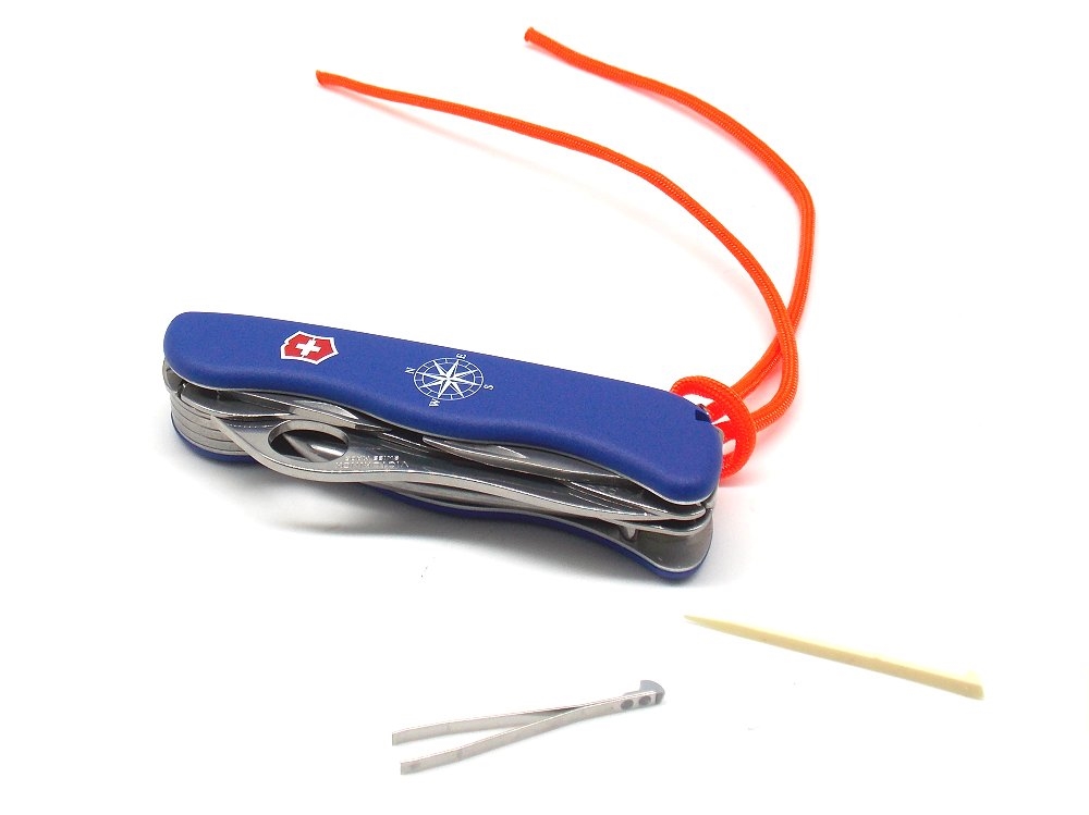 Coltello sportivo. Funzioni: lama grande ed ondulata, apribottiglie bloccabile, spelafili, cacciavite 7,5 mm, aprigrilli, sciogli nodi, apriscatole, cacciavite 3 mm, alesatore, punteruolo, cavatappi, cacciavite Phillips, pinze, tronchese, crimpa fili, pinzette, stuzzicadenti, anello portachiavi. Manico in polimero blu. Lunghezza da chiuso 11 cm. Peso: 210 grammi. Prodotto in Svizzera.