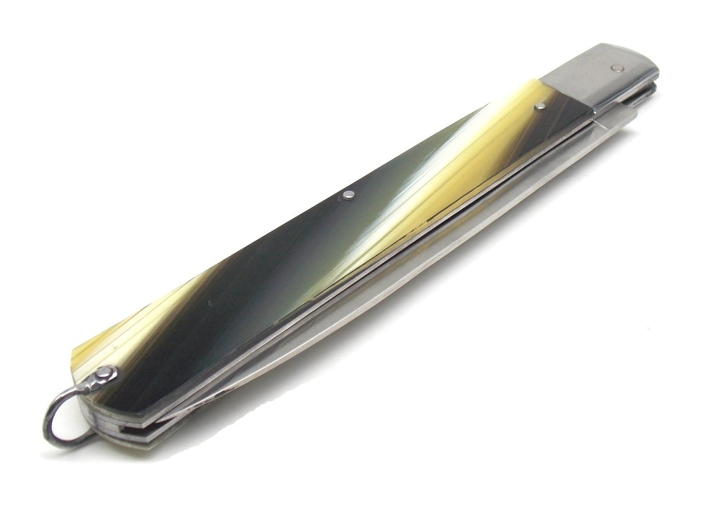 Coltello sportivo. Lunghezza lama 13,5 cm, larghezza lama 2 cm, lunghezza totale aperto 32 cm. Lama e tesina sono in acciaio. Manico in finto corno. Dotato di anellino. Prodotto in Italia. Peso lordo: 174 grammi.