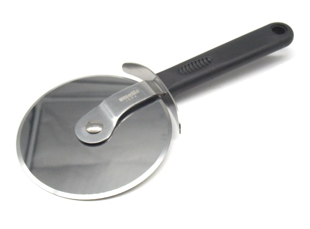 Rotella in acciaio inox, manico nero in polimero. Diametro rotella 10 cm, lunghezza 22 cm. Manico dotato di foro per appenderla. Prodotto in paesi extra UE. Peso lordo: 146 grammi.
