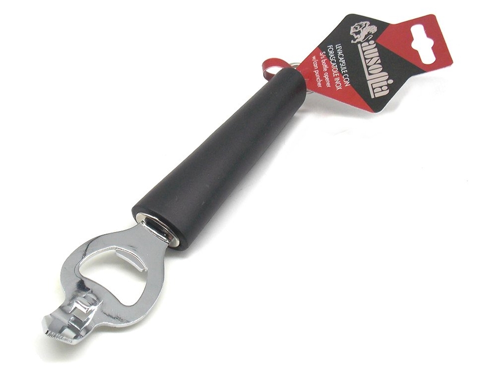 Cavatappi con fora barattoli, con impugnatura in abs. Lunghezza totale 19 cm. Con foro per appenderlo. Prodotto in Cina. Peso lordo: 80 grammi.
