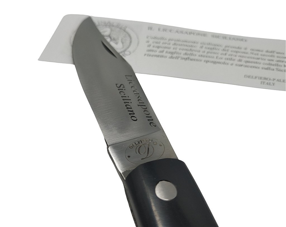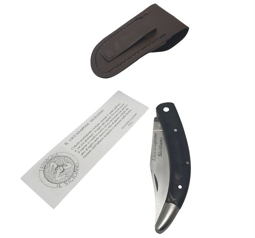 Lunghezza lama 10 cm, larghezza lama massima 2,4 cm, lunghezza totale aperto 22 cm. Manico in corno scuro. Dotato di fodero colore cuoio con passante dietro per cinturoni. Coltello prettamente siciliano, prende il nome dall uso a cui era destinato: il taglio del sapone. Lo stile di questo coltello ha risentito dell influsso spagnolo e saraceno sulla Sicilia. Scriita Palermo alla base della lama. Peso lordo: 149 grammi