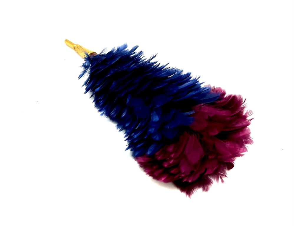 Pennacchio in piuma bicolore blu e amaranto con bicchierino in metallo per essere incastrato alla fascia millerighe del berretto. Lunghezza cm. 13, diametro pennacchio: cm. 8. (Berretto non incluso). Peso lordo: 25 grammi.