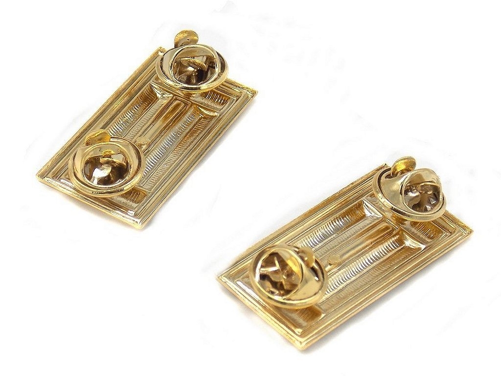 Coppia di alamari in metallo per camicia in colore verde e dorato. Lunghezza 3,8 cm, larghezza 1,8 cm. Dotata di due chiodini a morsetto. Peso lordo: 7 grammi. Prodotto in Italia.