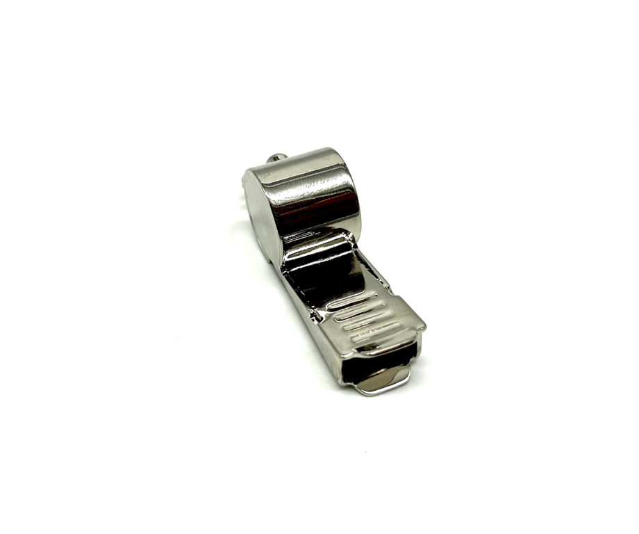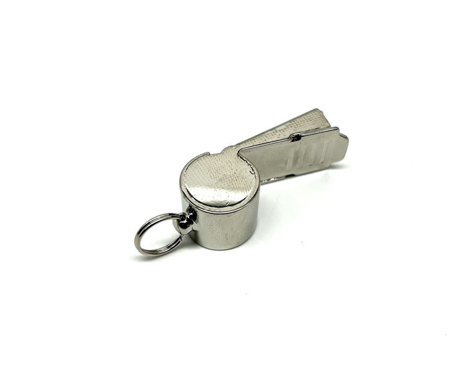 Fischietto in metallo cromato grande con pallina interna e con anellino per l aggancio di una cordicella o di una catenella. Misura cm 4x1,4. Peso lordo: 22 grammi.