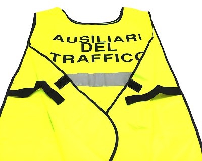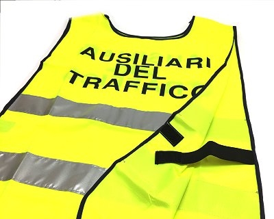 Corpetto alta visibiltà con scritta ausiliari del traffico, davanti e dietro. Taglia unica regolabile, aperto lateralmente con elastici regolabili. Dimensioni corpetto giallo cm. 69x46. Peso lordo: 230 grammi.
