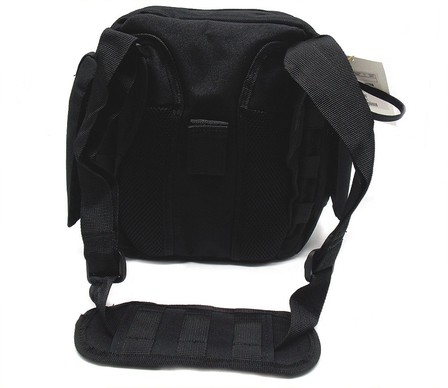 Borsa in nylon nero. Ampio vano interno imbottito con due tasche. Un ampia tasca sul davanti che si chiude con pattina e strip. Due tasche laterali espandibili tramite cerniera. Tracolla regolabile. Altezza 29 cm, larghezza 26 cm. Peso lordo: 800 grammi.