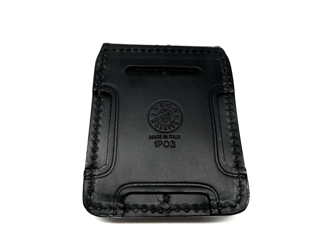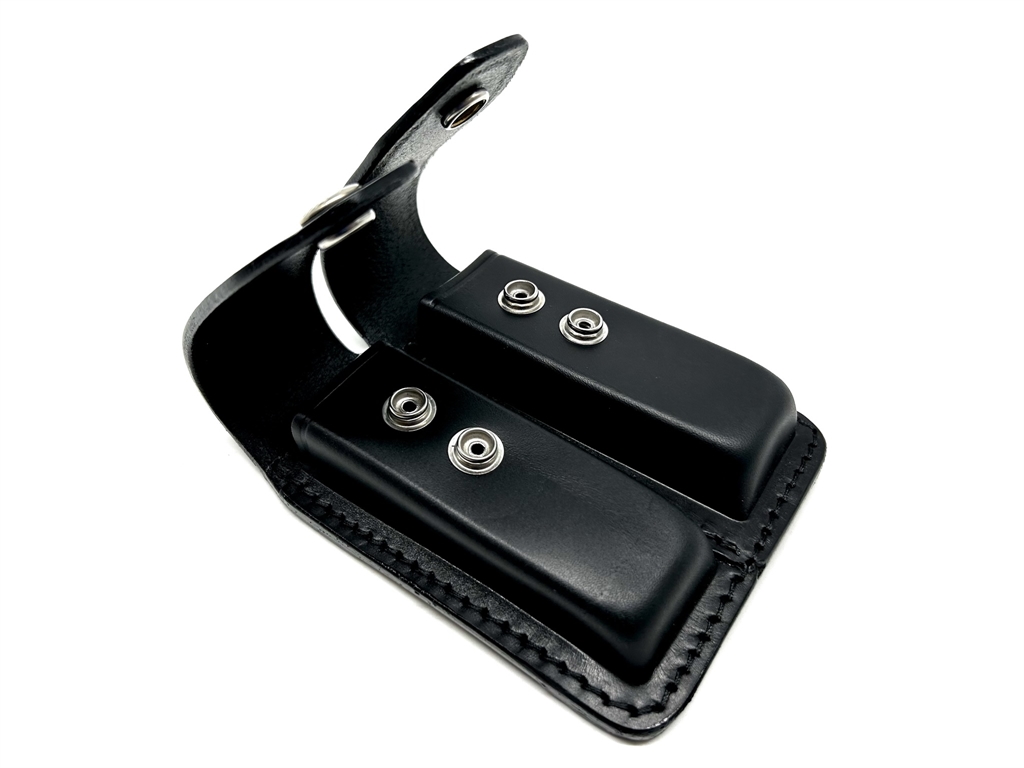 Porta caricatore in pelle doppio bottone, 2 posizioni, orizzontale o verticale. Lunghezza massima 15 cm, larghezza 9,8 cm. Passante per cintura altezza massima 5 cm. Disponibile in colore nero e bianco. Peso lordo: 145 grammi. Prodotto in Italia.