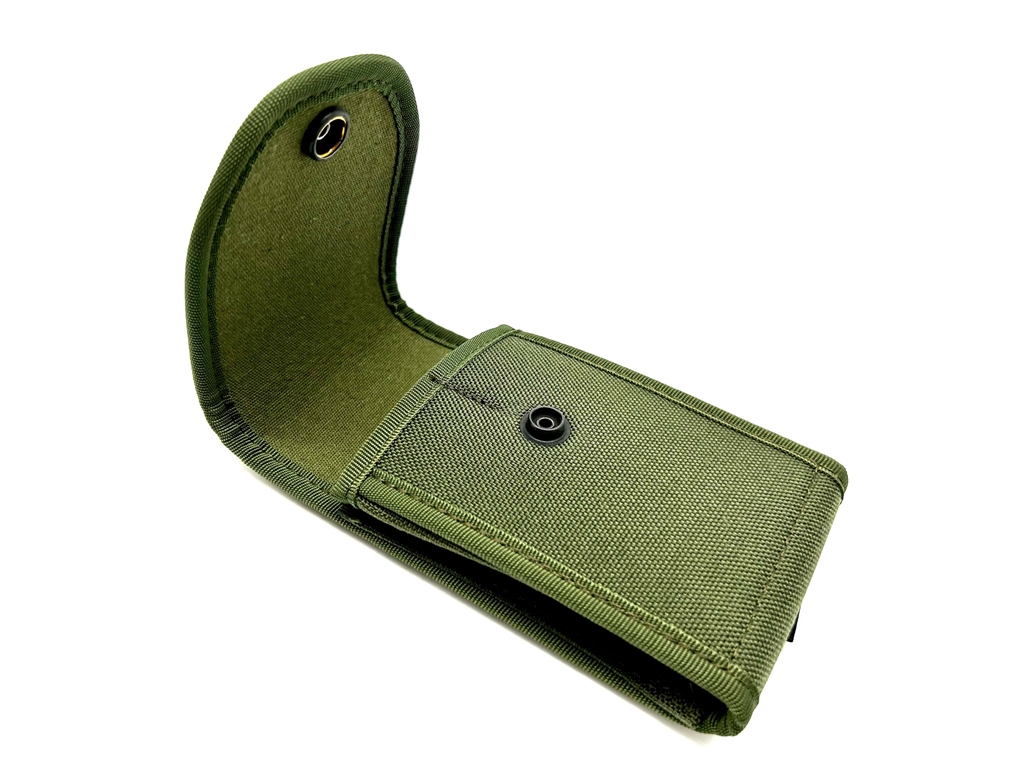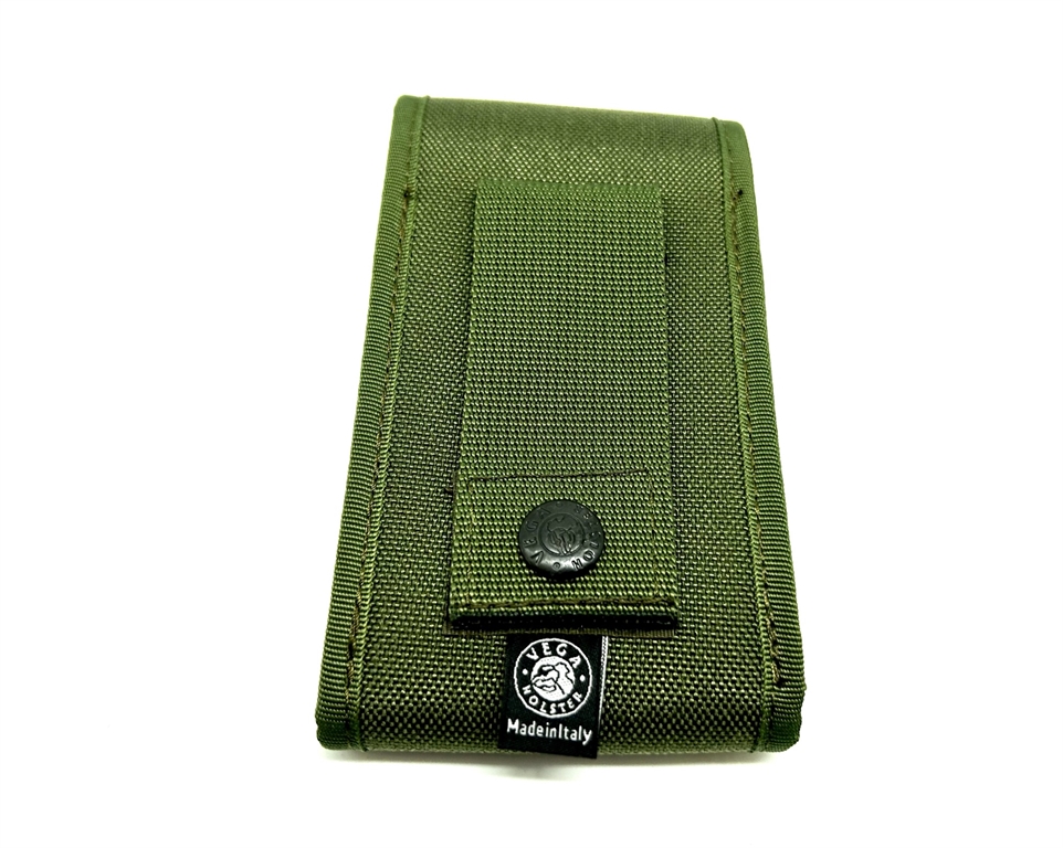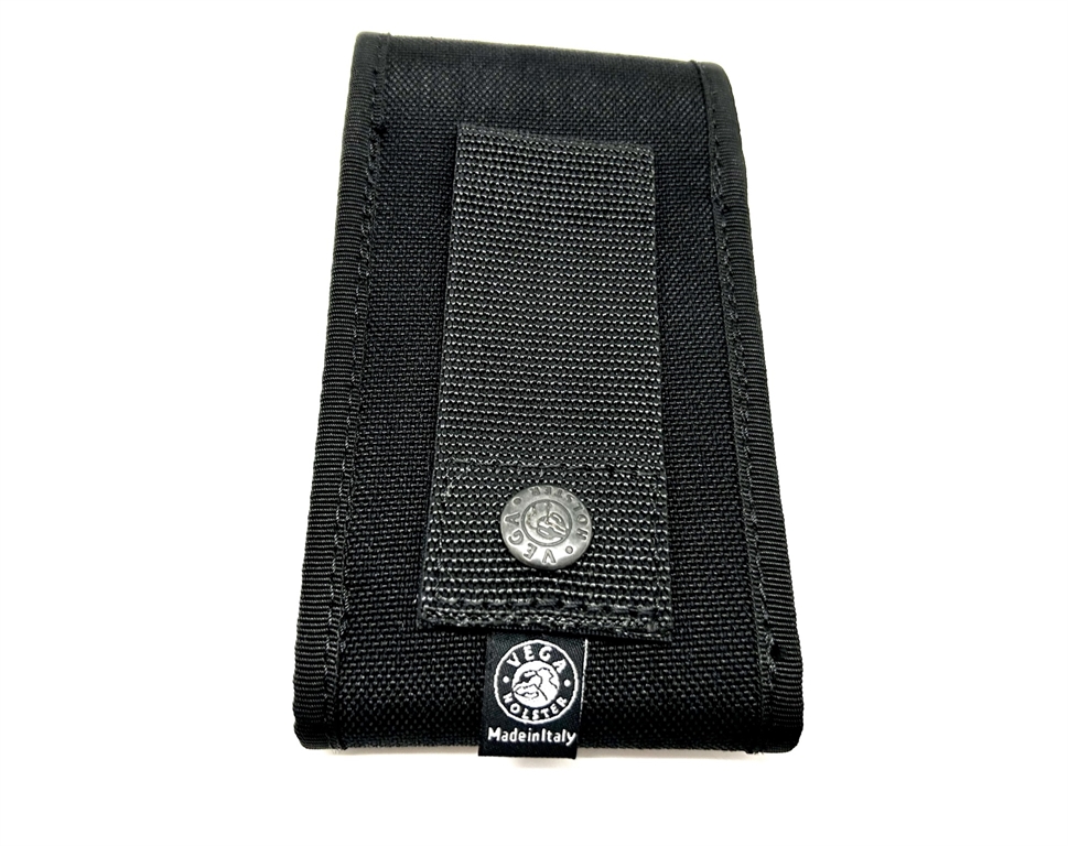 Porta caricatore doppio. Dimensioni: lunghezza 15 cm, larghezza 8 cm. Passante per cintura apribile altezza 7 cm. Colori disponibili: nero, verde, blu, bianco. Peso lordo: 55 grammi. Prodotto in Italia.