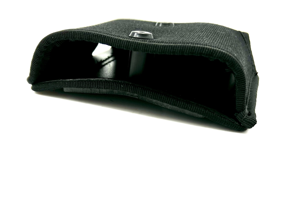 Porta caricatore doppio aperto in cordura nera con passante in polimero. 2 posizioni orizzontale o verticale dimensioni: lunghezza 10 cm, larghezza 12 cm. Passante per cinturoni alti massimo 6,5 cm. Peso lordo: 70 grammi. Prodotto in Italia.