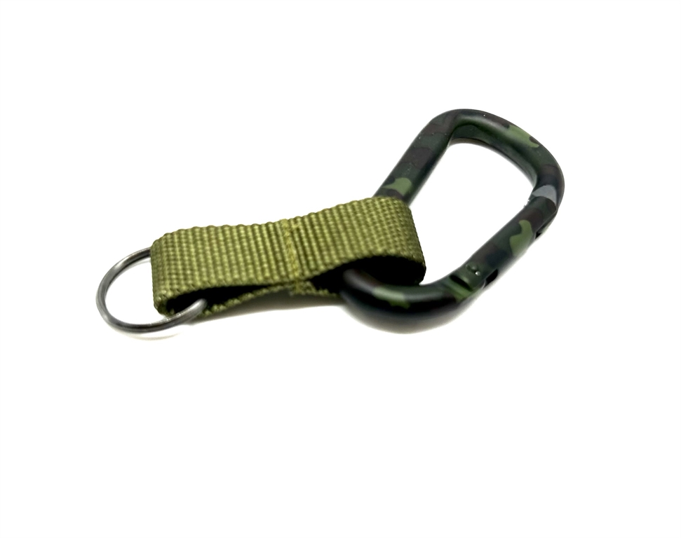 Moschettone in alluminio mimetico con nastro in nylon verde con anello spaccato per chiavi. Lunghezza del moschettone 7,5 cm, larghezza massima 4,3 cm. Diametro del anello 2,5 cm, prolungo in nylon 6 cm. Non adatto per climbing. Peso lordo: 30 grammi.