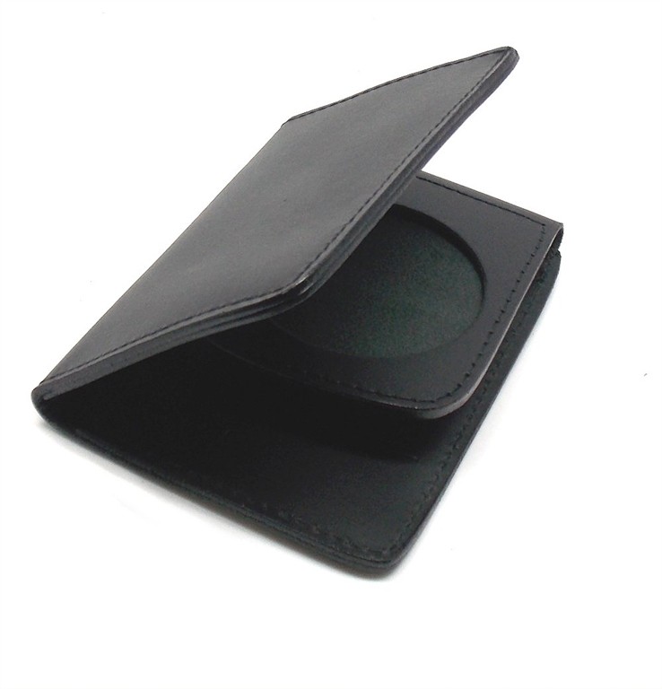 Portafoglio con porta placca vuoto. Dimensioni da chiuso: altezza 13 cm, larghezza 9 cm. Il porta placca ha diametro 6 cm. Prodotto in Italia.peso lordo: 95 grammi.