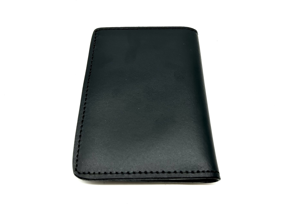 Portafoglio in pelle nera. Dimensioni da chiuso: larghezza 9 cm, altezza 13 cm. Con fregio in metallo. Peso lordo: 134 grammi. Prodotto in Italia.