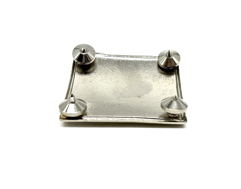 Piastrina in ottone nichelato neutra ( senza adesivo ) trapezoidale per spalline da giacca con dietro 4 viti e dadi a coppiglia. Peso lordo: 32 grammi.