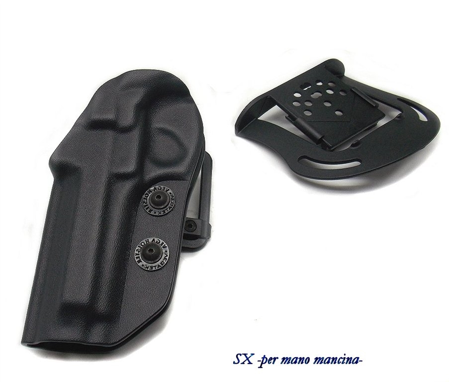 Fondina in polimero a spessore maggiorato. Doppia vite di ritenzione che agisce sul ponticello e sulla canna. Doppio sistema di passante incluso: a) paddle con inclinazioni ed altezza regolabile, b) passante asole con inclinazione ed altezza regolabile. Prodotta per le seguenti armi: beretta 92, 98, px4 storm , colt 1911 e similari, cz sp02 shadow 2, glock 17, 18, 19, 22, 23, 25, 31, 32, 37, h&k usp compact, sig sauer pro 2022, taurus pt92, 99, 100, 101, walther ppq, walther p99q. Le asole del passante sono per cinturoni alti da 4 a 5 cm. Prodotto in Italia. Peso lordo: 235 grammi.