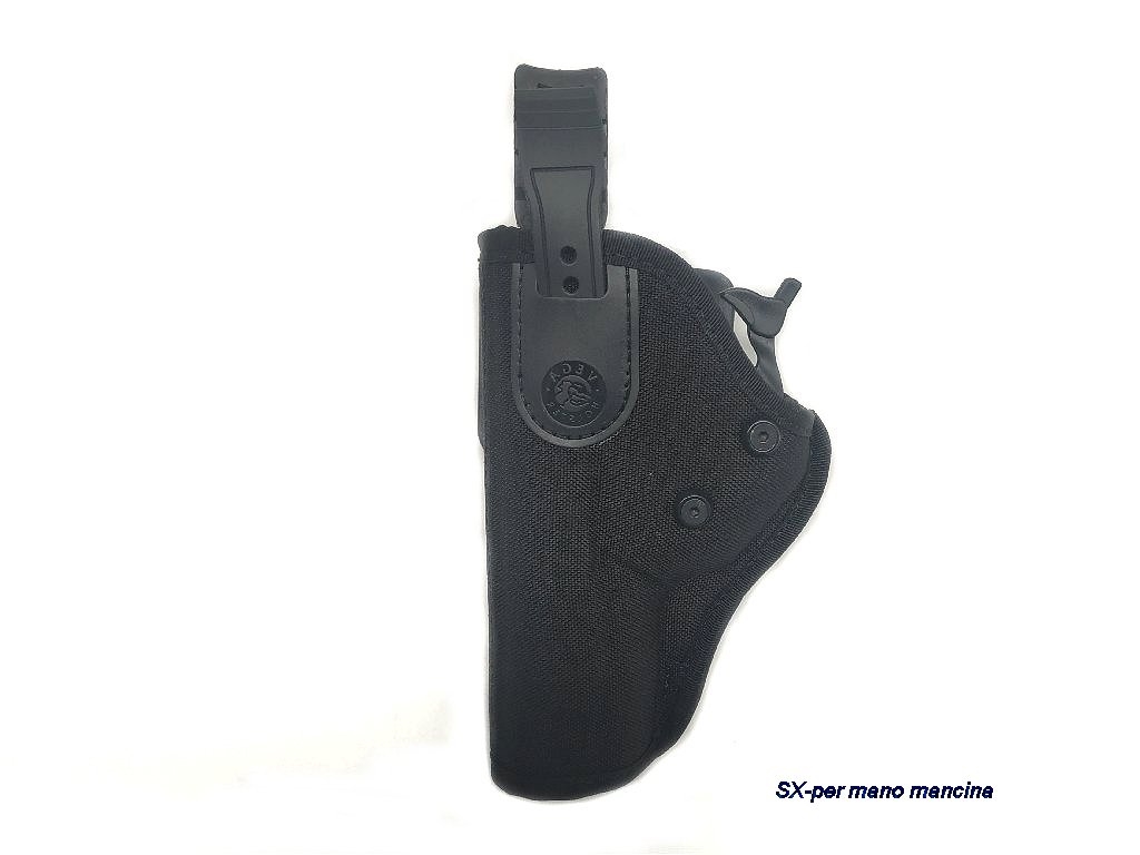 Fondina per uso in divisa. Triplo sistema di sicurezza: pull side automatico e sgancio rapidi, passante per cintura in polimero con tripla inclinazione. Prodotta per le seguenti armi: beretta 92, 96, 98, px4 storm, glock 17, 19, 22, 23, 25, 31, 32, 37, 38, h&k usp compact, p2000, sig sauer pro 2022, p228, p229, sprinengfield xd, taurus pt 92 ,99, 100, 101, walther p99. Colori disponibili: nero, blu. Le asole del passante sono per cinturoni alti 5 cm. Peso lordo: 265 grammi. Prodotto in Italia.