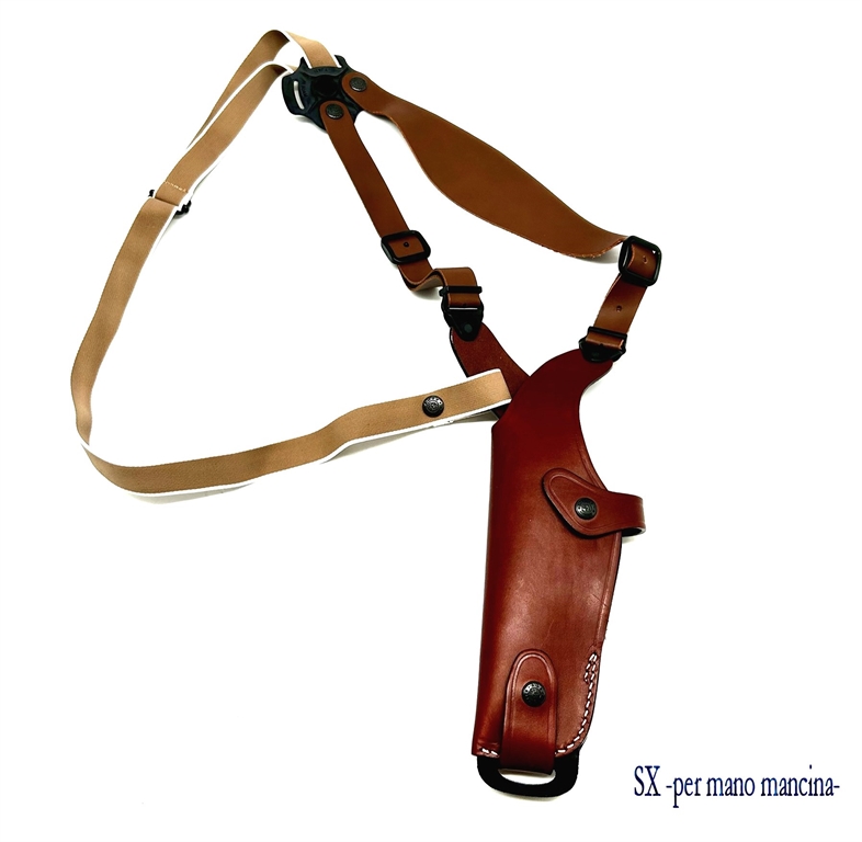 Fondina ascellare verticale in cuoio marrone foderata internamente in scamosciato con fermo alla cintura e sicura regolabile. La particolare forma ad incrocio tiene la fondina più aderente al corpo. Fondina adatta per: Beretta 90two, 98a1, px4 storm, 92, 96, 98, Browing hp, Colt 1911, Cz 75sp, H&K USP, Glock 17, 20, 21, Sig Sauer P220, P226, Tanfoglio force. Peso lordo: 275 grammi. Prodotto in Italia.