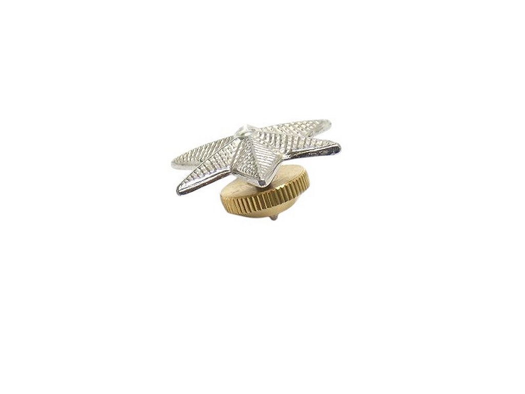 Stella argentata a sei punte con vite in metallo zigrinato leggermente bombato. Diametro massimo: 21 mm. Peso lordo: 1 grammo.